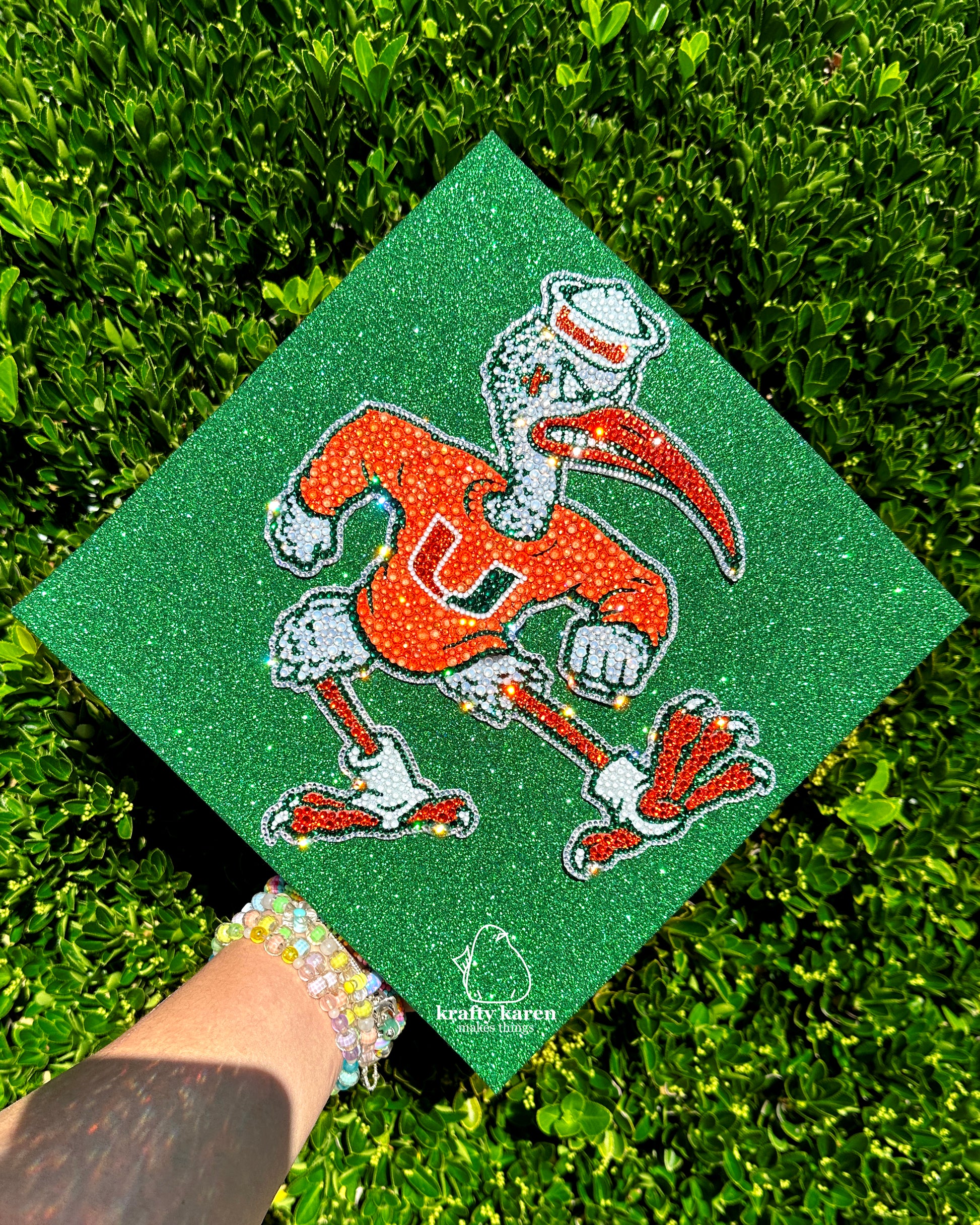 This "partially rhinestoned" grad cap topper includes a rhinestone Sebastian the Ibis logo with a green glitter background that measures 9.5" x 9.5" to fit any standard graduation cap. Topper comes with an adhesive backing for easy application to the top of your graduation cap.